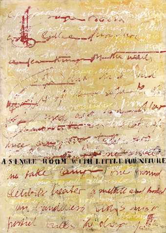 A single room with little furniture a few things on the walls, a number of things on two tables, and on a kind of sofa that’s used as a table. A few things on the floor: A cot, a sofa, three chairs, two tables, two rugs, one heavy one light one big one small, one table lamp, one round electric heater, a metal and frosted glass chandelier, with three small frosted electric bulbs, the shape of candleflame. On one chair sits the typewriter. It’s cover leans upright against the sofa…